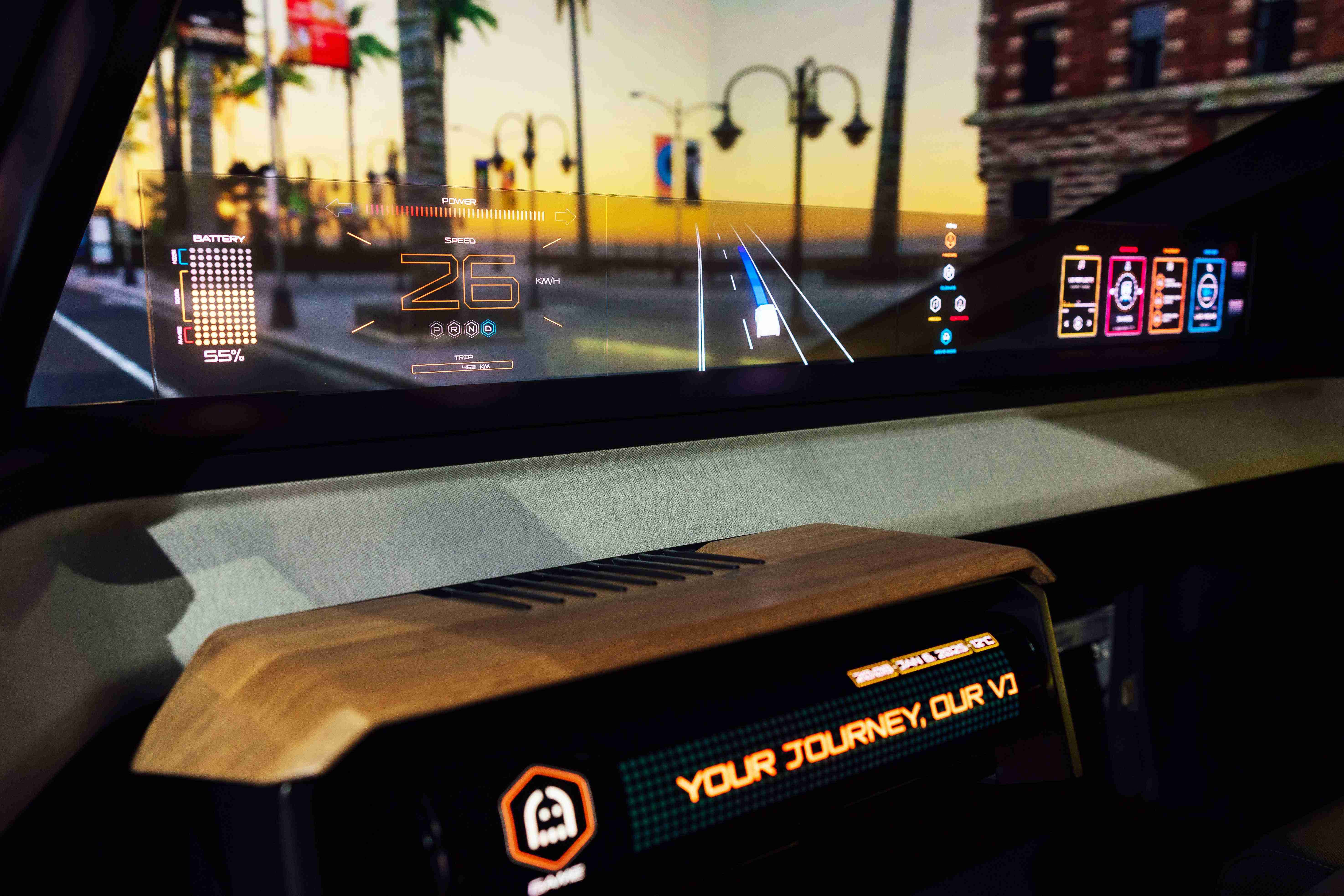 车用运算方案驱动无界透明显示介面(Horizon Image Glass),,整合仪表板、、中控及副驾显示功能为一体式全景呈现,,,不仅提供清晰的外部视野,,,,亦能即时显示车辆状态、、、导航及路况资讯,,并赋予个性化设定与驾驶安全警示等加值化服务。。