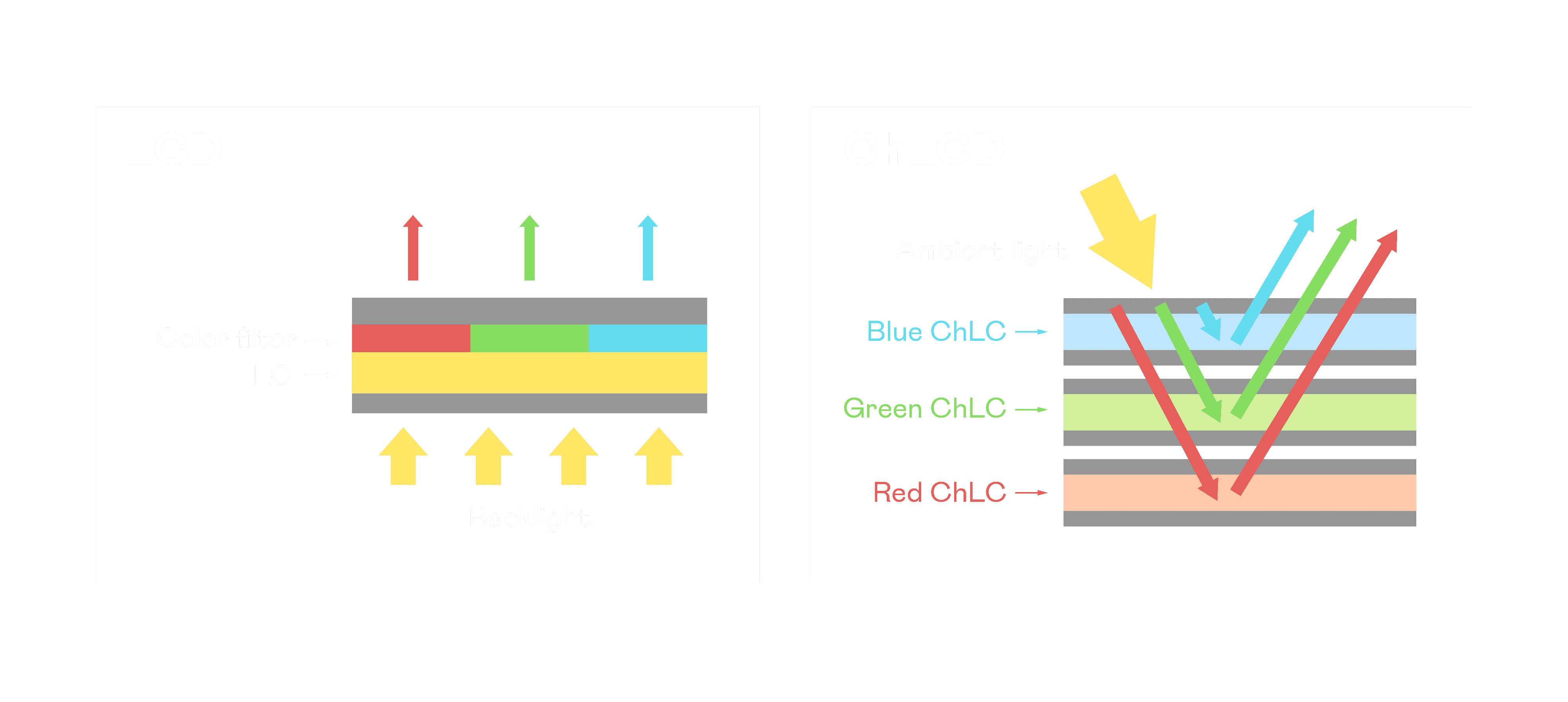 ChLCD 胆固醇液晶就如同纸张一样,,透过反射环境光来显示影像,,,,因此长时间观看不易造成人眼视觉疲劳,,可达到护眼效果。。。当处于户外阳光下使用,,,,LCD 影像容易失真而不易观看,,,但胆固醇液晶仍可维持较佳的影像品质。。。。