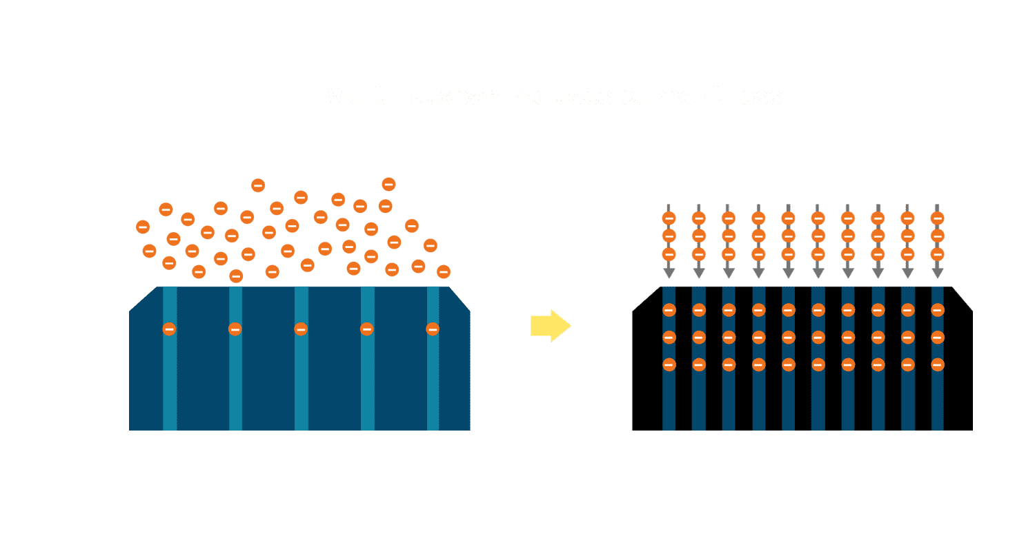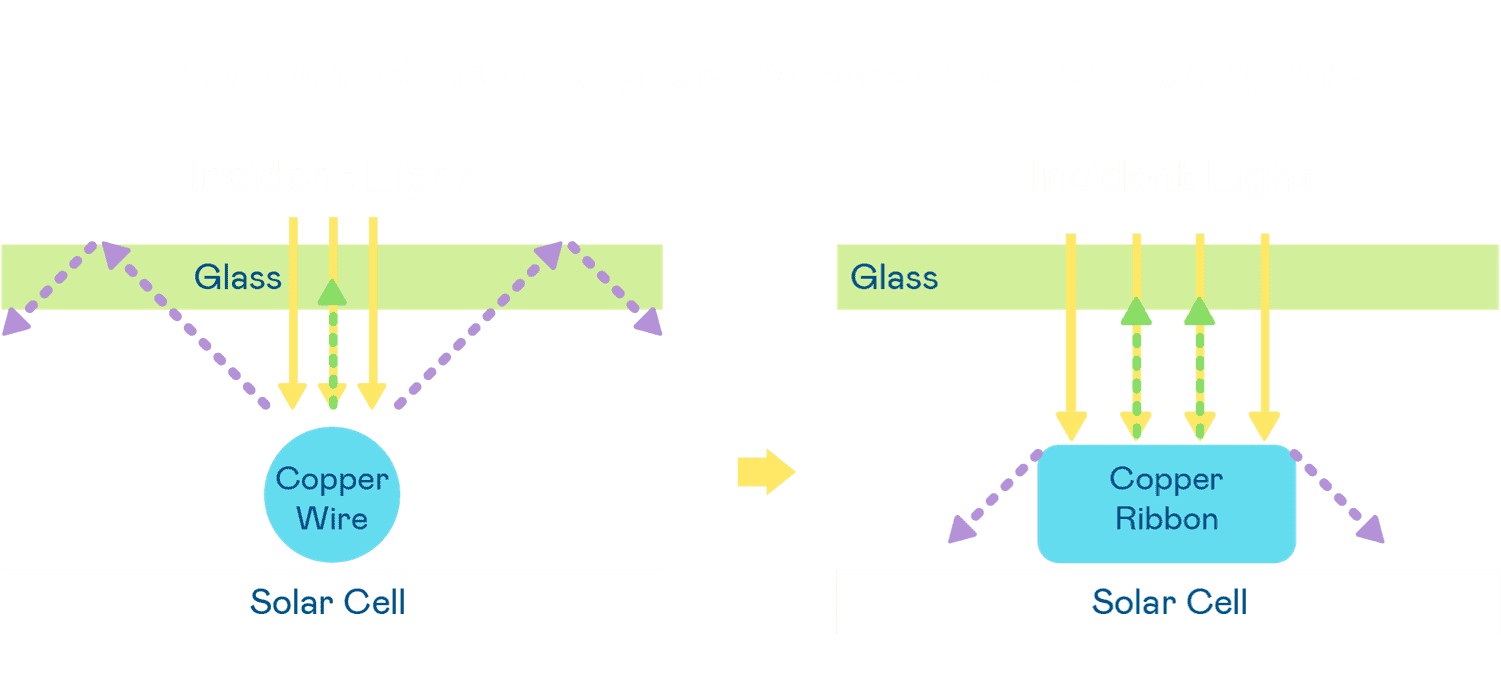 • 电池使用多条铜导线 (Copper wire) 于电池片上形成较短的电流路径,,,,提高电流收集效率,,,,采用圆形设计的铜导线较传统扁平式的铜焊带 (Ribbon),,,可增加入射至电池的光线量。。。。