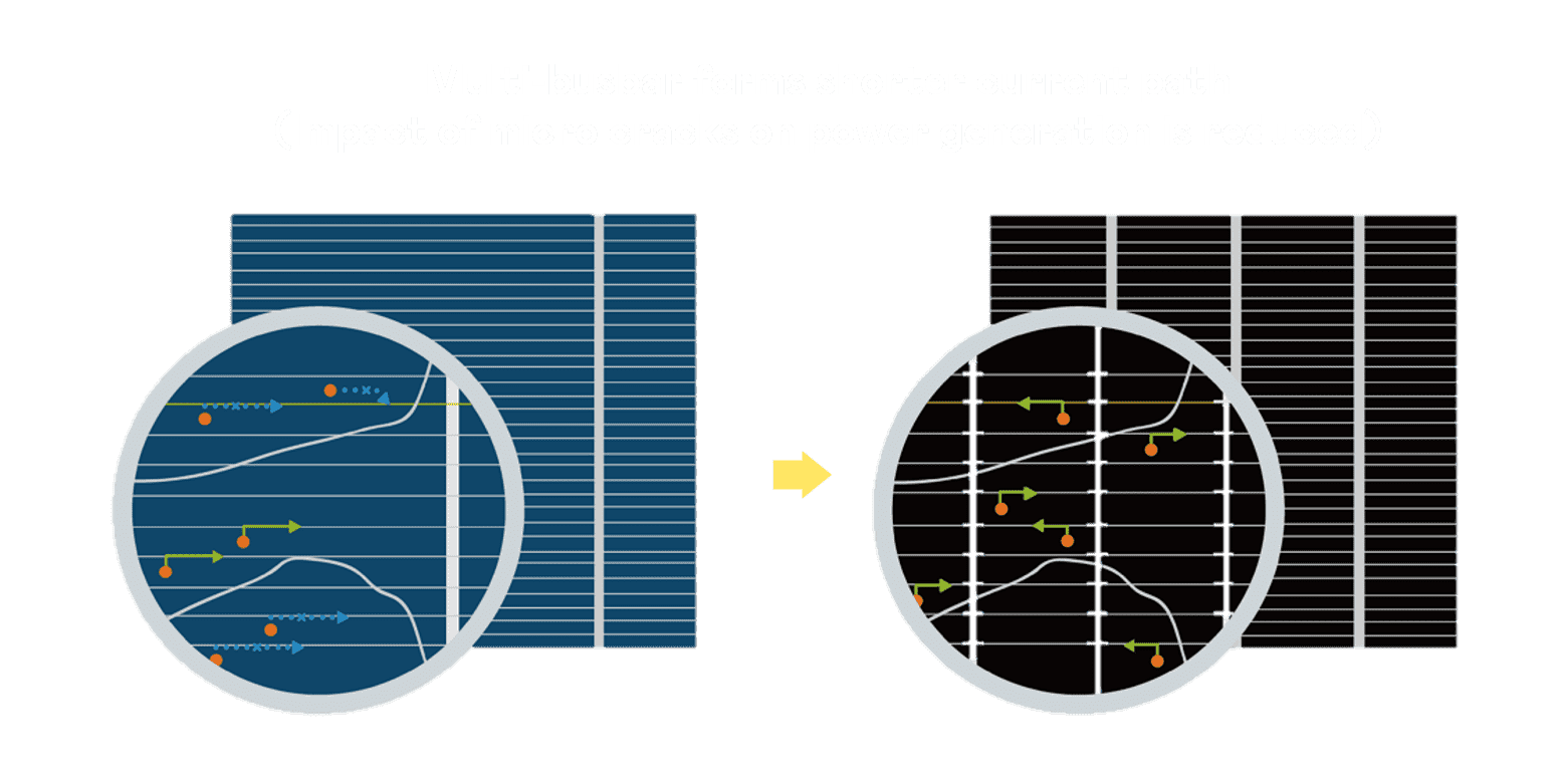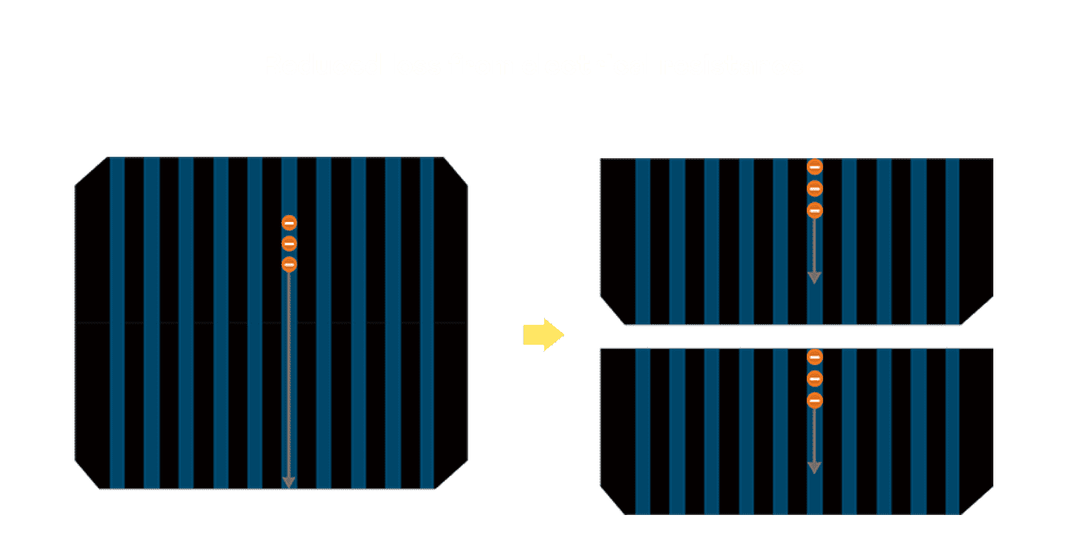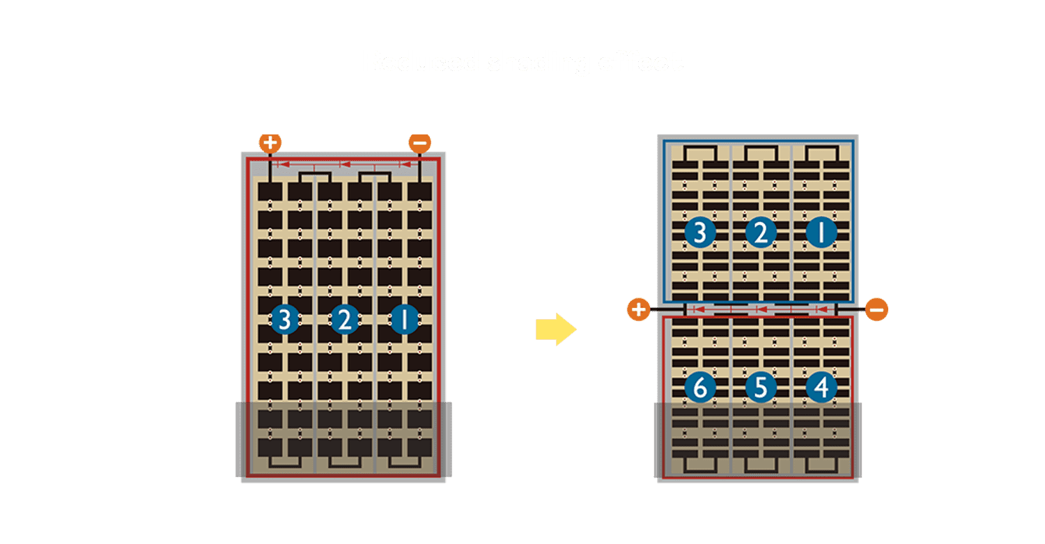 • 结合半切电池,,,降低遮阴影响、、、提升模组抗隐裂能力、、、并减少电阻损耗,,进一步提升模组发电效能。。。